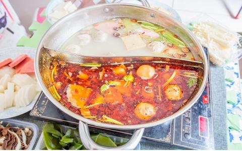 如果喜歡吃辣,可以選擇鴛鴦鍋,將吸油量高的配菜放入清湯鍋內(nèi),吸油量低的配菜則可以放入麻辣鍋中。