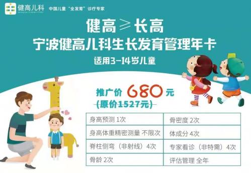 生長(zhǎng)發(fā)育管理年卡:生長(zhǎng)發(fā)育管理年卡重磅登場(chǎng),身高體重精密測(cè)量不限次+身高預(yù)測(cè)1次+脊柱側(cè)彎(非射線)4次+骨齡2次+骨密度2次+體成分4次+專(zhuān)家看診(非特需)4次+評(píng)估管理全年,原價(jià)1527元,推廣價(jià)680元。