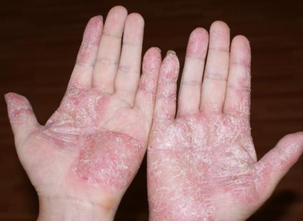 第二個類型就是角化鱗屑型,角化型的最后其實就是整個手掌,局部或者整個的手掌都會變得很厚、皮膚很硬,甚至還要脫皮。到了冬天,因為氣候干燥又加重,甚至有的還可以有皸裂、裂口這類的表現。