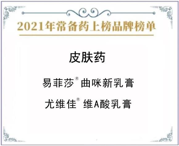 歷經6個多月的渠道申報、市場調查、專家評審、人氣好評、榜單公示等環節,被譽為“家庭常備藥品風向標”的“2020~2021年中國家庭常備藥上榜品牌”榮譽榜單重磅發布!我司“易菲莎®曲咪新乳膏”、“尤維佳®維A酸乳膏”兩個品牌光榮上榜!