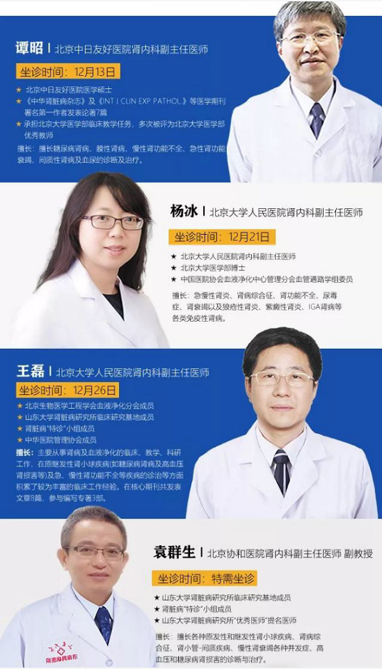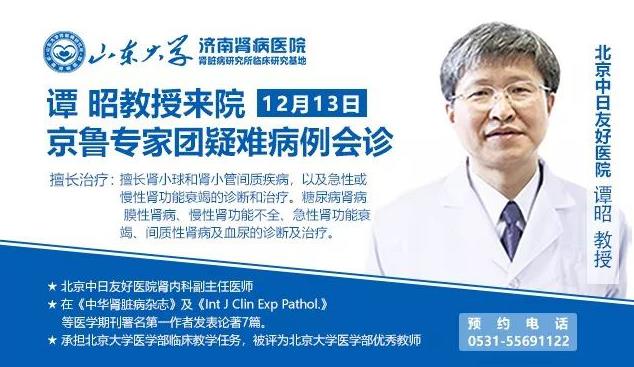 更好的幫助廣大腎臟病患者擺脫疾病困擾,讓患者們真正享受到京魯權威專家團會診服務。2019年12月13日(本周五),北京中日友好醫院腎內科專家譚昭教授將來到我院,與“京魯名醫專家團”攜手開展腎臟病學術交流與疑難病例會診,助廣大腎友遠離疾病煩惱!