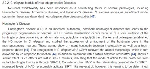 亨廷頓舞蹈病是一種遺傳性神經疾病,可導致神經元進行性變性,表現在身體運動不協調、心智衰退。在線蟲模型中發現,使用沉默信息調節因子SIRT1的激活劑或使SIRT1表達上調可以減輕軸突變性,恢復軸突形態。由于NAD+是SIRT1發揮活性的必需底物,因此NAD+含量的增加也會激活SIRT1,用于亨廷頓舞蹈病的治療。