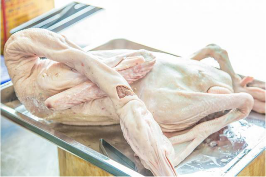 1、把光鵝開腹取出內(nèi)臟,洗凈晾干,用精鹽100克抹在鵝身內(nèi)外,并用竹筷一段挺在腹腔內(nèi)。