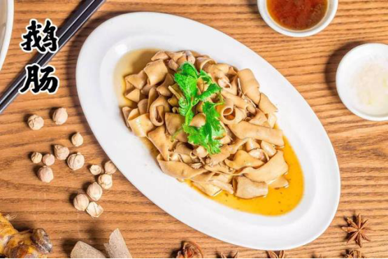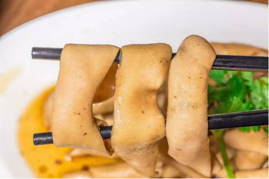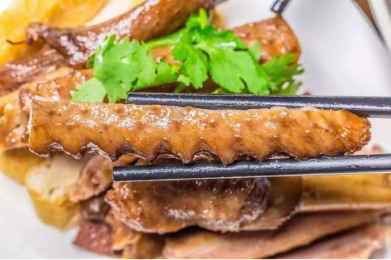 潮鹵獅頭鵝腸比普通鵝腸更寬厚,蘸上鹵汁味道更濃郁。而且還特別有韌勁,放在嘴里嚼,耳邊會有“咯吱咯吱”的響聲,又脆又有嚼勁!