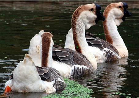 獅頭鵝為目前我國農(nóng)間培育出的最大優(yōu)良品種鵝,也是世界上的大型鵝之一。原產(chǎn)廣東饒平縣浮濱鄉(xiāng)。多分布于澄海、潮安、汕頭市郊。羽毛灰褐色或銀灰色,腹部羽毛白色。頭大而眼小,頭部頂端和兩側(cè)具有較大黑肉瘤,鵝的肉瘤可隨年齡而增大,形似獅頭,故稱獅頭鵝。