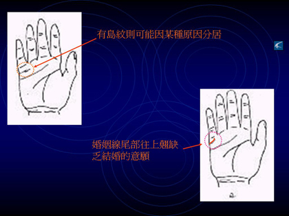有金星帶的人,心細,但性情較為激烈。影響線多的人,容易沉迷于戀愛中。有旅行線的人,喜歡旅行而愛好變化。有直感線的人,直覺敏銳。有放縱線的人,很難抗拒劃性對他的誘惑。