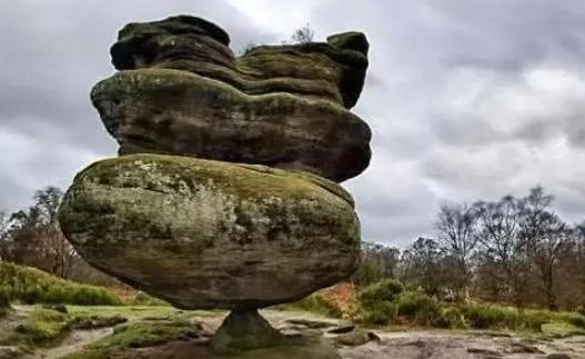 在英格蘭北約克郡的伯明翰荒野方圓50公頃的領(lǐng)域,分布著許多這樣形狀奇特姿勢(shì)也奇特的平衡石,其中最突出的一個(gè)被叫做偶像石。這塊估計(jì)有200噸重的巨石把它碩大的身軀安置在一塊與它相比非常袖珍的、錐形的小石頭上,無(wú)法想象它們的接觸點(diǎn)上承受著多大的壓強(qiáng)。