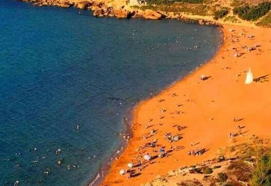 位于馬耳他群島的拉姆拉灣,這很罕見,但確實存在。橙色是由于沙子里含鐵量高,但卻又沒有火山巖中顏色較暗的沙子來中和。