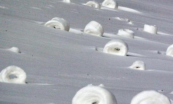 雪卷是被風(fēng)吹卷起的雪堆,通常是圓柱形,長的極像白色干草卷的雪卷最高能達(dá)2英尺,這些被風(fēng)吹卷起的雪堆,形似蛋糕卷,多為圓柱形。雪卷是自然界中的一種罕見景象。像這種大塊的雪團(tuán)從山上滾下來的自然現(xiàn)象發(fā)現(xiàn)于北美以及英國地區(qū),都知道雪球越滾越大,但是在它的中心部分很脆弱,沒有那么結(jié)實(shí),以至于在風(fēng)的作用下,將中間部分的雪吹空了,形成了一個(gè)孔洞,遠(yuǎn)遠(yuǎn)看去就像個(gè)甜甜圈一樣。因?yàn)樗男纬蓷l件比較苛刻,所以雪卷十分罕見!