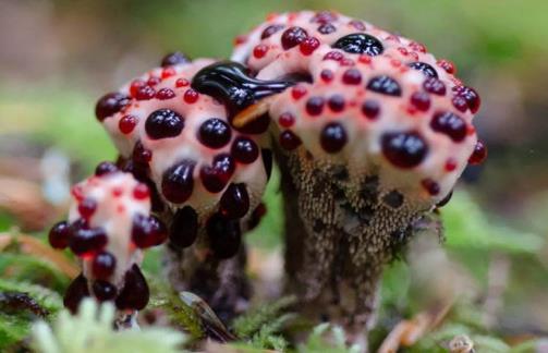 出血齒菌學名“Hydnellum pecki”,是真菌家族不同尋常的成員之一。這種蘑菇有很多名字,通常都與汁液或者血液有關(guān)。人們可能認為這種蘑菇上面血紅色的液體是森林動物濺到白色菌蓋上的血液。我們可以在北美洲發(fā)現(xiàn)出血齒菌的身影,但這種蘑菇在西北太平洋地區(qū)更為常見,通常生活在針葉樹林。此外,出血齒菌也存在于歐洲,最近又在伊朗和韓國發(fā)現(xiàn)它們的蹤跡。乍一看,人們可能認為這種蘑菇上面血紅色的液體是森林動物濺到白色菌蓋上的血液。如果仔細觀察你就會發(fā)現(xiàn),紅色液體是從蘑菇上的小孔滲出的。