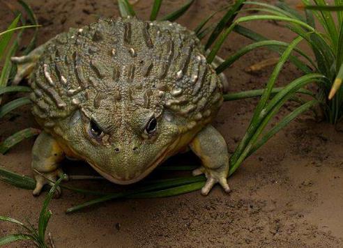 非洲牛箱頭蛙,簡稱非洲牛蛙,體型巨大,體重可達2公斤,體長一般在20厘米以上,雄性體型大于雌性。非洲牛箱頭蛙是世界上第二大的蛙,主要棲息在熱帶和亞熱帶的濕草原、灌木叢以及湖泊沼澤、溝渠中。它的攻擊力很強,一次能夠條三米多高,當受到刺激后,它會在自己的跳躍范圍內向任何一個運動的物體猛撲過去,然后將獵物整個吞下去,致使獵物窒息而死或者休克。非洲牛箱頭蛙合攏嘴巴時,它們的牙齒就像碎玻璃,通常蹲著不動,靜待獵物送上門來。