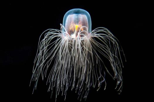 燈塔水母是一種小型水母。身體呈鐘型,直徑約4-5毫米,身體透明,能夠看見紅色的消化系統,狀如燈塔,因而得名。燈塔水母胃巨大且呈現出鮮艷的紅色,橫斷面為十字型。世界上唯一真正發現不老的動物,可以說是“不老,不死,不生,不滅”的存在。它在性成熟后會重新回到水螅型狀態,并且可以無限重復這一過程,從而擁有了返老還童的能力。紐約布魯克戴爾大學醫院研究員馬洪寶說:“水母避開死亡的這種能力使它在生物學上是不死的。”這使得這種水母成為唯一一種只要不被吃掉或病死,理論上會長生不死的生物。