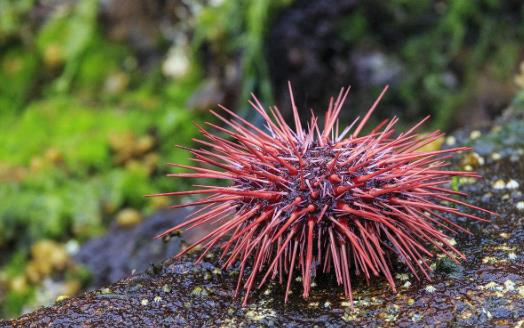 紅海膽又名巨紫球海膽,只能在太平洋中發現它們的蹤影,主要生活在北美的西海岸沿岸。它們生活在淺灘區域,有時候是巖石上,或者低潮線向下90米的水中,但是它們不會呆在波濤洶涌的地方。它們把自己的體刺用作高蹺在海底爬行。如果你發現一只紅海膽,記得告訴你的長輩,因為一些個體的壽命超過了200年。
