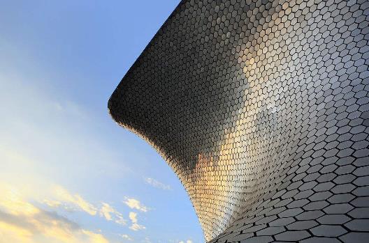 這座博物館是一個有機的多維建筑,不透明的外墻用大量六邊形的鋁制模塊搭建,看上去有點像古代武士的鎖子甲,獨特的形狀造就了其強大的存在。