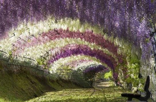 紫藤隧道坐落于日本福岡縣北九州市的河內藤園中,每年的櫻花季節過后,隨之到來的是紫藤花,每年的4月至5月是觀賞紫藤隧道的最佳時間。紫藤具有較高的園藝裝飾價值和藥用價值,紫藤為長壽樹種,人們極喜種植,成年的植株莖蔓蜿延屈曲,開花繁多,串串花序懸掛于綠葉藤蔓之間,瘦長的莢果迎風搖曳,漂亮至極,是到日本旅游的必游景點。春季紫藤爛漫,其枝蔓如同葡萄藤,匍匐而上,將公園的一條大道裝扮成為由不同顏色組成的隧道,浪漫至極,雖然花期僅僅有半個月,但是絢麗多姿的紫藤隧道讓世界瞬間變的魅力無限。