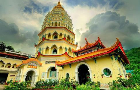 檳城極樂寺位于檳城州的亞依淡,建于1893年,占地12公頃,寺廟依山而建,依山眺海,景色怡人,猶如佛教中所描述的西方極樂世界,因而被人稱之為“極樂寺”。極樂寺是馬來西亞的重要佛教寺廟之一,最先建立的是大士殿,5年后相繼增建天王殿、大雄殿、藏經閣、東西客堂及放生池等。極樂寺內的萬佛塔非常引人注目,有7層高,此塔的底部,中部和頂部分別采納了中國,泰國和緬甸寺廟的設計,綜合了3國寺廟的建筑風格。2002年,一座30.2米高的觀音銅像建成,觀音慈容含笑,右手握朝下的凈瓶,把甘露灑在檳州這片青翠土地上。
