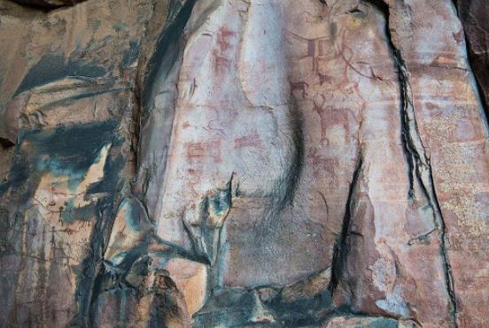 溫迪亞山脈的比莫貝卡特石窟位于印度高原心臟地區(qū)南部邊緣的溫迪亞山脈丘陵地帶。在相對密集的森林之上是大量的沙石巖,有五組天然石窟,里面巖畫的歷史從中石器時代一直延續(xù)到文明歷史時代。21個毗鄰石窟遺址的村莊居民的文化傳統(tǒng),與石窟巖畫中所描繪的內(nèi)容有極大的相似之處。比莫貝卡特石窟擁有大量精美的巖畫,反映了人與自然之間的長期相互作用,從石窟的巖畫藝術(shù)和石窟周圍村莊這種巖畫藝術(shù)傳統(tǒng)的遺跡中可以看出,比莫貝卡特石窟是與以狩獵和采集為主的社會經(jīng)濟密切聯(lián)系的。
