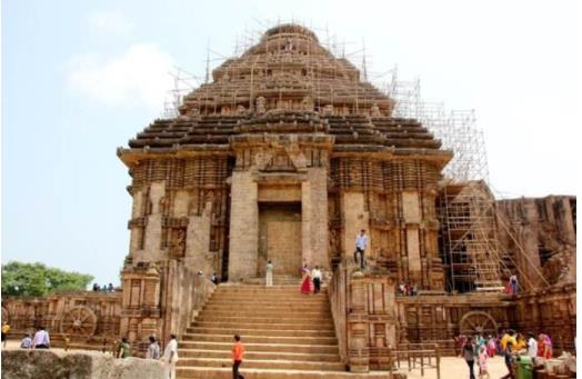 太陽神廟由13世紀的羯陵伽國王那羅辛訶•提婆建造,是婆羅門教的圣地之一,1984年被聯合國教科文組織列入世界文化遺產名錄。太陽神廟長857英尺,寬540英尺,朝向東北方,是印度最莊嚴的建筑物之一。神廟整體被設計成太陽神蘇利耶的戰車形狀,有12對輪子裝飾和七匹馬拉,不僅外形宏偉、比例完美,更體現出一種宗教的和諧。神廟的線條裝飾、渦形紋,動物和人的完美造型,都使它在印度神廟中顯得特別。
