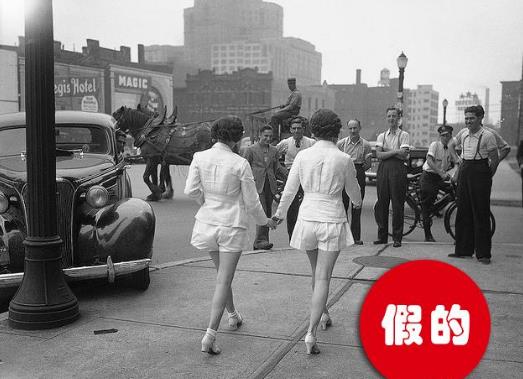 這張照片在互聯網上很是出名,當時美國某照片分享網站的一位用戶給出了一個標注:“女性首次穿著短褲出現在街道上,造成了車禍。” 這聽起來很美,但這個故事其實是偽造的。這是一張分階段的照片。該系列還有著幾幀畫面。此外,女性短褲雖然分布不廣,但在那時(1937年的照片)仍然不是新鮮事。如果仔細觀察,可以注意到車上沒有任何劃痕,也就是說這根本就不是什么車禍現場。