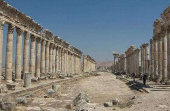 阿帕米亞是一座希臘風格的古城,其歷史可以追溯到大約2300年前,是塞硫古第一任國王塞硫西斯德建立的城市,以塞硫西斯德妻子的名子命名的。公元6世紀后,阿帕米亞古城曾遭到波斯人、阿拉伯人的破壞,1157年大地震的使阿帕米亞最終成為廢墟,現今這個阿帕米亞古城遺址成為一個觀光旅游的景點。通往阿帕米亞的道路崎嶇不平,高低不平的道路兩旁是一條整齊的列柱大道,阿帕米亞古城遺跡也是因為這條列柱大道而聞名的,大道自北向南長約1.85千米,87米寬,螺旋形刻紋的希臘廊柱是別處難以見到的。