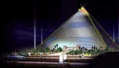 顯然源于埃及金字塔所帶來的靈感,又不失現代化的風格。這個金字塔充分利用空間,并將于兩旁兩個較小的金字塔房屋作為開發商的辦事處和商業空間,使之整體成為一座龐大的主題公園。