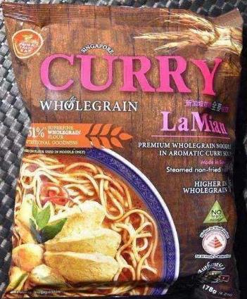新加坡咖哩全谷拉面也是新加坡百勝廚制造出來的一款泡面,其面餅也是用全麥制成,不同之處就是其料包中有一袋咖喱,使其湯汁也是富含了濃厚的咖喱味,口味獨特,但其味道絕對是鮮美的!