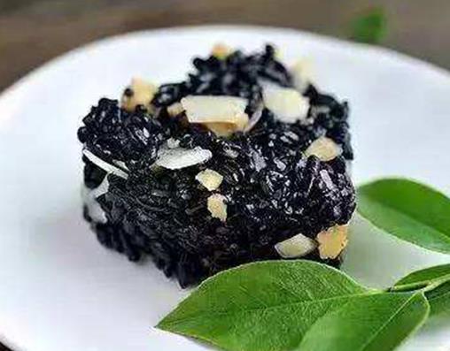 烏米飯在唐代就有了,是木瀆的一道傳統小吃,還曾在《舌尖上的中國》紀錄片里出現過。它的原料是糯米,在被南燭的葉汁浸泡一夜之后,使本來潔白的糯米烏黑發亮。