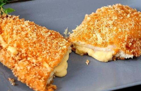 爆漿雞排里面的漿其實就是芝士,芝士在常溫下是固態,可以直接和雞胸肉一起層層疊加。芝士的味道比較香甜,和雞肉一起搭配,能消除雞肉的腥味。油炸后的雞胸肉口感非常的鮮嫩多汁,芝士在融化后,又能滲透進雞肉中,可以大大提升雞肉的口感和味道。