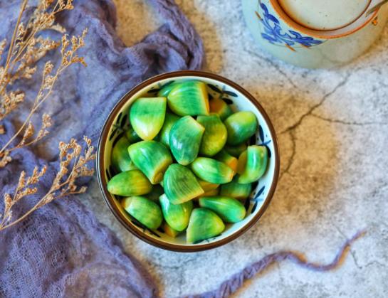 臘八蒜其實(shí)很簡單。將去皮的大蒜放入干凈密封的罐子里,然后倒入醋,封口,放在陰涼處。20天左右,用醋泡過的大蒜會變綠,像翡翠一樣。