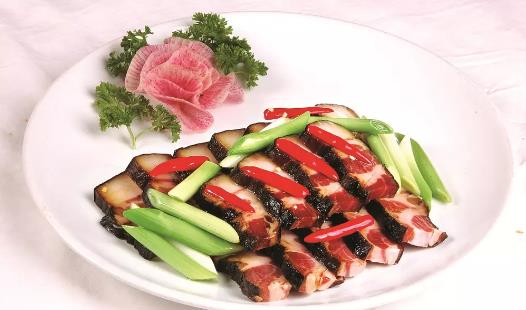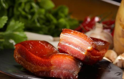 2. 臘肉選用新鮮的帶皮五花肉,分割成塊,用鹽和少量亞硝酸鈉或硝酸鈉、黑胡椒、丁香、香葉、茴香等香料腌漬,再經風干或熏制而成, 具有開胃祛寒、消食等功效。