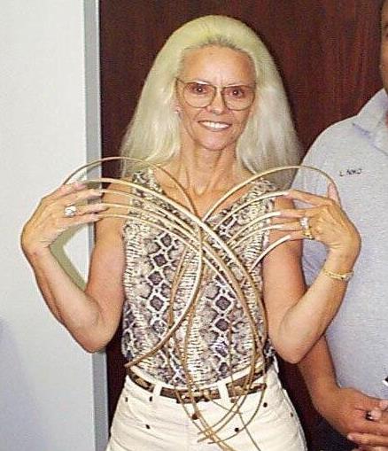 李·雷德蒙德是一位65歲的美國女子,而她就是目前世界上指甲最長的人紀錄保持者,她的指甲長達8米65(如上圖),上面的圖片看到沒有?簡直是恐怖啊!這么長的指甲估計什么活都干不了了吧,曾經在2006年的時候,她是以7米61的成績被吉尼斯世界紀錄官方給載入其中,后來在2008年在次測量之后發現總長度已經到了8米65了(10根手指長度相加)。