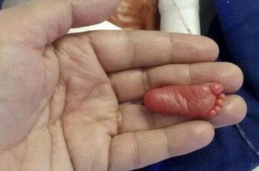 剛出生的Manushi,皮膚透明,器官發育不全,身長只有22厘米。上圖為Manushi的腳掌,她的腳掌還沒有一個成年人的手拇指大,Manushi一生下來,就被送往到了重癥監護室內,她的父母一直對她不離不棄。