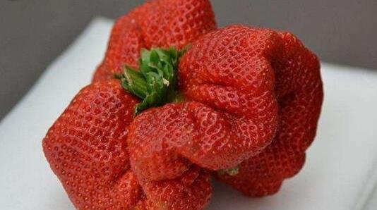 看到外形這么奇特的草莓,很多人都懷疑他是打了草莓激素的,不然普通草莓怎么會長成這么奇葩的樣子。其實水果突變是有很多原因的,比如霜凍,也是會影響草莓生長的。這么一顆大草莓的長成,是由多方因素組成的。