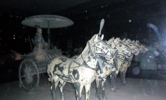 出土的兩乘銅車馬,已經(jīng)修復(fù)并在秦俑博物館展出的是二號(hào)銅車馬,二號(hào)車為單轅雙輪,車輿呈“凸”字形,上有車盒,一衡二軛在車的一條轡繩末端有刻文:“安車第一”二號(hào)車應(yīng)是一輛安車•車馬通長(zhǎng)328。4厘米,高104。2厘米。