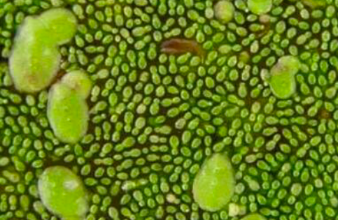 無根萍為種子植物中體型最小的一種,無根無葉,葉狀體近球形,長約1.3-1.5mm,寬不到1mm。多數(shù)先端產(chǎn)生芽體繁殖。浮生在靜水池沼的水面。花小,雌雄同株,生于葉狀體表面,無佛焰苞。不常開花。果實(shí)球形。生長適溫為22~32攝氏度,低于20攝氏度或高于35攝氏度生長緩慢。蕪萍是出芽繁殖,從開始岀芽到種子脫離母體為1個(gè)繁殖周期,在水溫30攝氏度時(shí)歷時(shí)3~4小時(shí),20攝氏度時(shí)8~12小時(shí)。飄浮水面或懸浮,細(xì)小如沙,為世界上最小的種子植物。葉狀體卵狀半球形,單1或2代連在一起,直徑0.5-1.5毫米,上面綠色,扁平,具多數(shù)氣孔,背面明顯凸起,淡綠色,表皮細(xì)胞五至六邊形;無葉脈及根。