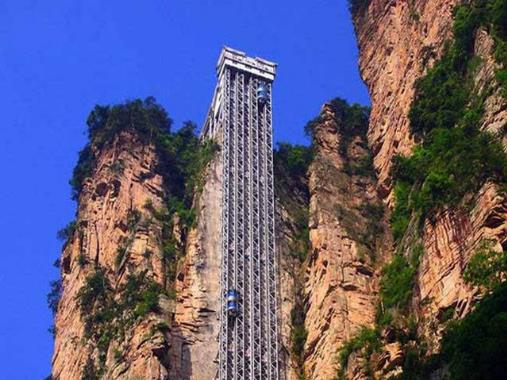 在湖南張家界武陵源風景區建造的百龍旅游電梯,是目前世界上最高的全暴露雙層、最大載重、速度最快的戶外觀光電梯。該電梯依山體垂直而建,垂直高差335米,運行高度326米,由156米山體豎井和171米貼山鋼結構井架組成,由3臺雙層全暴露觀光電梯并列分體運行,每小時可運送3000名游客,共耗資1.2億元。