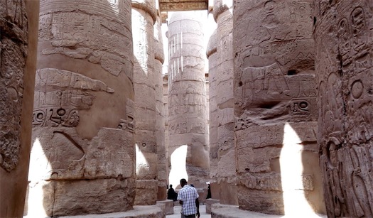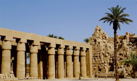 卡納克神殿因為其浩大的規模而揚名世界,它是地球上最大的用柱子支撐的寺廟。形象地說,卡納克神殿的體量可以裝下一個巴黎圣母院,占地超過半個曼哈頓城區。卡納克神殿的大柱廳,約5000多平方米,廳內樹有134棵石柱,分16行排列,中央兩排特別粗大,每根高達21米,直徑3.57米,可容納100個人在上面站立。柱頭為開放的紙莎草花。想象一下,這些石雕彩繪的大柱已經在這里站立了幾十個世紀。整座大廳用如此密集的粗柱創造出一種震撼人心的效果。