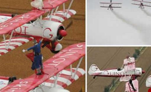 這場世界上最大膽的婚禮空中婚禮的地點是在英國格洛斯特郡,牧師在中間的飛機上,新郎新娘分別在左右的兩架飛機上,用固定支架綁住,婚禮在親友的注視下升空完成。