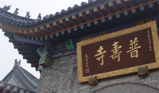 五臺(tái)山普壽寺,坐落于山西省五臺(tái)縣臺(tái)懷鎮(zhèn)東莊村南端,創(chuàng)建于北宋,光緒三十四年(一九○八年)重建后,獻(xiàn)于十三世達(dá)賴?yán)铩R痪啪乓荒暧扇缛稹⒚钜魞晌环◣焺?chuàng)辦中國(guó)五臺(tái)山尼眾律學(xué)院。