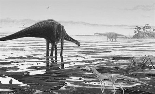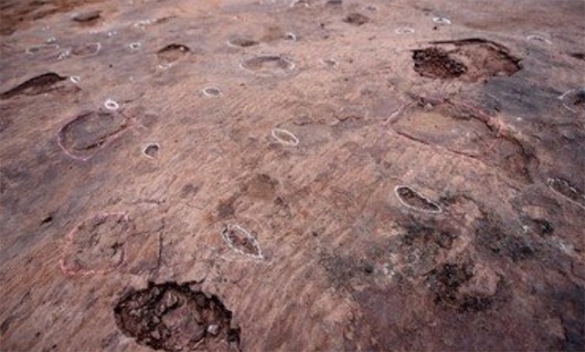 這些足跡是由20多條R齒龍留下的。巨齒龍是一種與霸王龍相似的食肉恐龍,但是它們生活在距今1.55億年前的侏羅紀晚期,那個時候霸王龍還未出現。新發現的足跡與過去在北美洲和歐洲發現的巨齒龍的足跡非常相似,這說明在侏羅紀晚期,巨齒龍的分布范圍很廣。巨齒龍的足跡顯示它的一只腳的足印并不落在另一只腳的前面,而是在左右足印之間有90多厘米寬的間距?茖W家據此推測,巨齒龍很可能像鴨子那樣搖搖擺擺地走路。