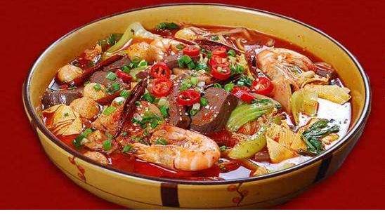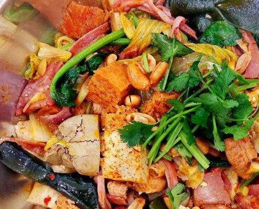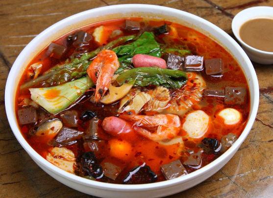 (8)可燙的原料:粉絲,粉條,河粉,海帶,油菜心,綠豆芽,白菜卷,雞肉絲,凈肉絲,豆腐泡等。客人吃得時侯先選料,燙熟后裝于碗中,澆上麻辣湯汁,撒上油酥花生,榨菜絲或丁,蔥絲,香菜段,淋上香油即可。