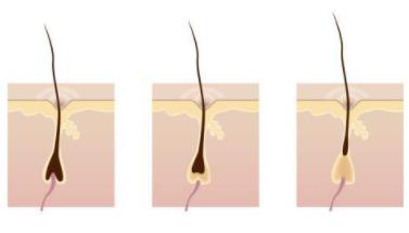 我們毛囊脫發后,由于某種原因無法生長頭發,這種狀況持續三個月以后,毛囊開始緩慢退化,停止生長,代謝減緩。經過休止、退行、假死直至最后的真死狀態。而這種現象多發生在”退行”和”假死”兩個狀態之間。還沒死,但是功能不行,長不出來了。