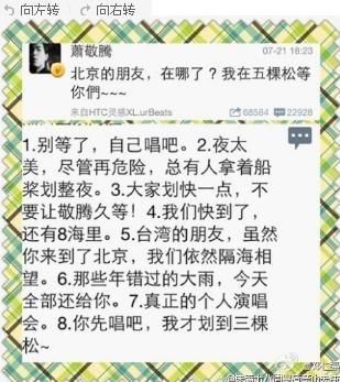 7月21日午后暴雨降臨,或許是擔心交通問題,蕭敬騰下午3點就在微博喊話:“今天下雨又塞車,北京的朋友,吃完中飯,向五棵松前進,等等見……