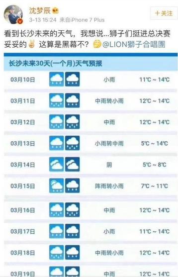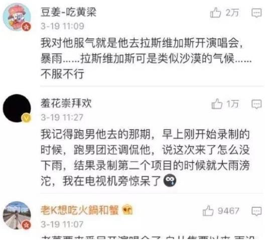 事實上,在首期節目蕭敬騰領軍獅子合唱團亮相之初,現場觀眾們就曾呼喚“雨神”相迎,他也不負眾望,每逢錄制就“布雨”,兢兢業業一場不落。沒想到,這樣的一個玩笑之談,卻在近日讓長沙人民叫苦不迭。原來,因為三月以來,長沙一直雨水連連不帶停,近半月不見晴天的當地群眾集體甩鍋“雨神”,更有甚者夸張地向節目組請愿“怒求”淘汰蕭敬騰,讓人哭笑不得。