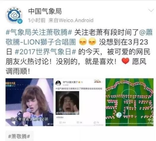 有人發現,中國氣象局關注了蕭敬騰。網友紛紛調侃:這是在密切關注競爭對手么?