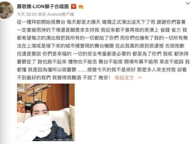 10日凌晨2點,蕭敬騰發文道歉,并感嘆覺得很難過,因為沒有讓歌迷看到最好的“我們”。