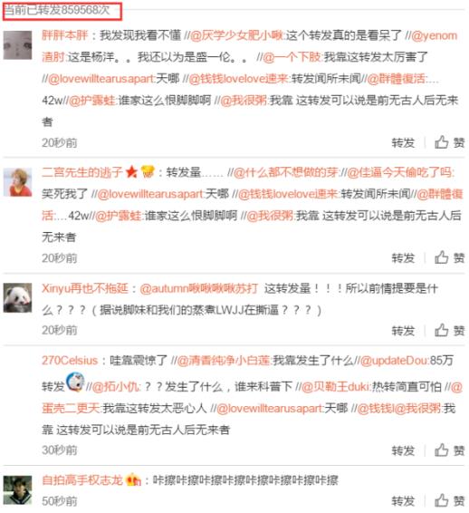 所以雙方就開撕了,雖然到現在還沒撕出來結果,但是這個轉發撕逼已經足以讓各大飯圈目瞪口呆。