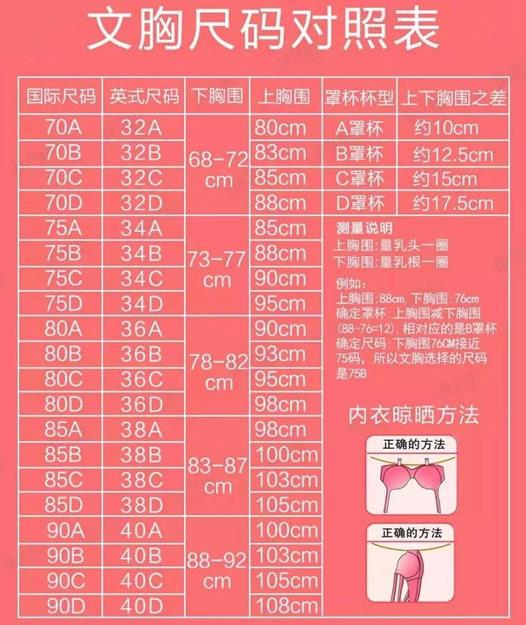 1、明確自己的胸圍(上胸圍和下胸圍),通常75中的75指的就是下胸圍。