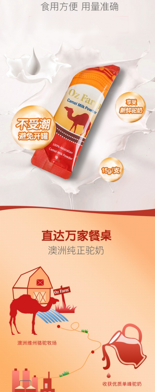 此外,澳滋駱駝奶粉是采用密封獨立包裝,無二次加工,避免了開罐受潮的可能,讓消費者能隨時隨地享受正宗的澳滋駱駝奶。