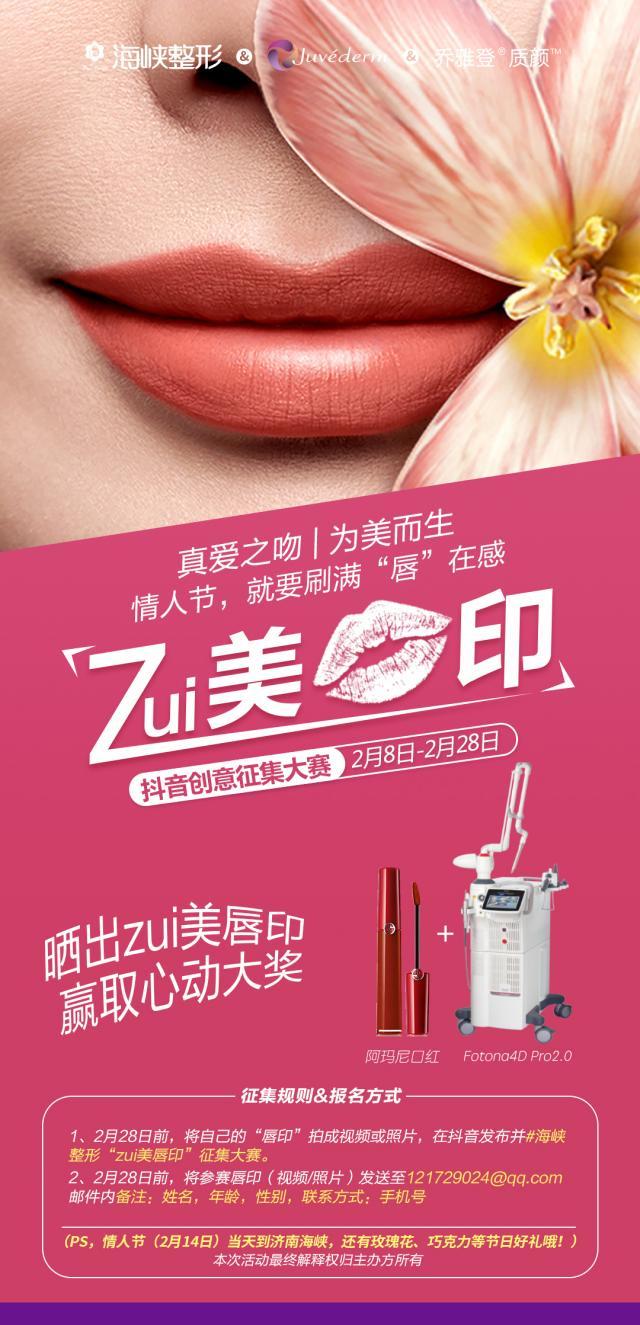 1、2月28日前,將自己的“唇印”拍成視頻或照片,在抖音發(fā)布并#海峽整形“zui美唇印”征集大賽